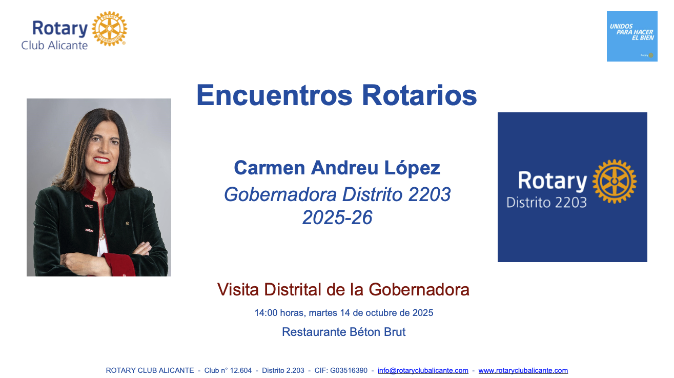 Nuestra querida Gobernadora nos visitara el dia 14 de octubre de 2025 al Rotary Club Alicante. El desarrollo del encuentro se inicia con un acto informal de recepción de invitados a las 14:00 horas, seguido de una comida de trabajo, al final de la cual tiene lugar la intervención del ponente. La sesión finaliza a […]