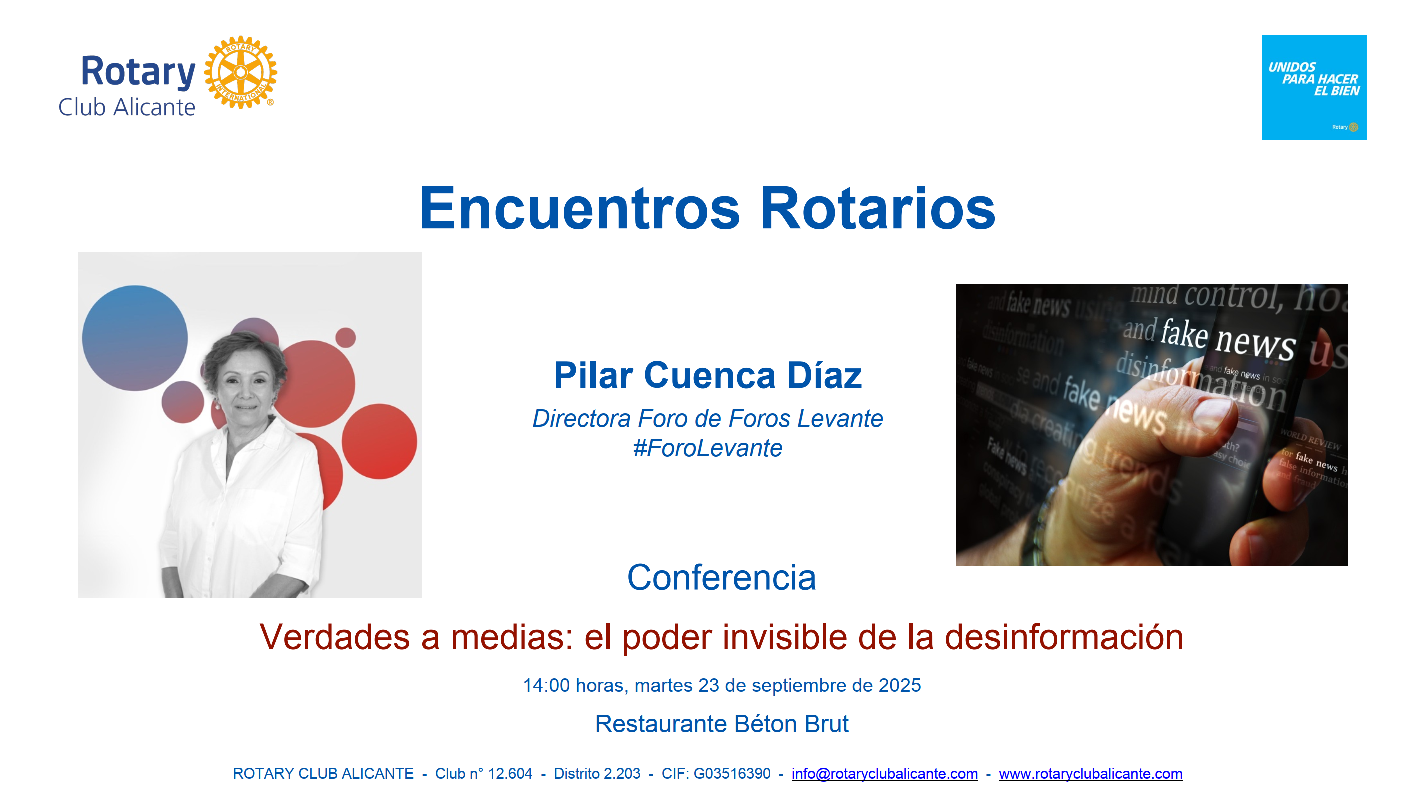 Nuestra invitada pronunciará la conferencia del próximo 23 de septiembre de 2025 del Rotary Club Alicante. El desarrollo del encuentro se inicia con un acto informal de recepción de invitados a las 14:00 horas, seguido de una comida de trabajo, al final de la cual tiene lugar la intervención del ponente. La sesión finaliza a […]